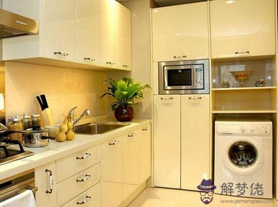 有些家庭可能會采取西方家居風格,將滾筒洗衣機擺放在廚房里面,洗衣機顯而易見是滾筒式的。具有干洗功能。這樣合理利用廚房空間,也是一個不錯的選擇。再加上洗衣機五行屬火土,土克水,土耗火。而廚房五行屬火,形成火土相生局,擺放在廚房也是不錯的選擇。