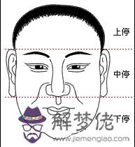 面相除了前述的‘五官’之外,還有所謂的‘三停’之分。如下面相圖1: