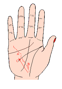 如果有這條線,則以勁而有力,成一直線為最理想,主健康活力強,在性的方面也頗有魅力,同時生活也很穩定;相反地如果這條線沒有氣力,又斷斷續續的話,表示身體衰弱,也失去性的魅力,健康線應以下端不碰到生命線為真健康(記號A),如果健康線越過生命線,表示內臟尤其循環器之衰弱(記號B)。