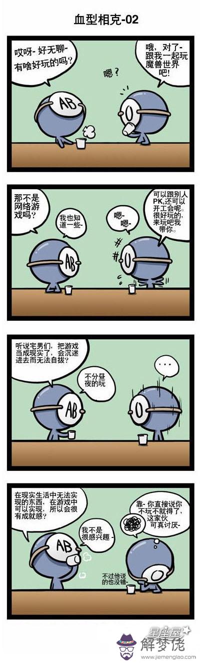 今天星座屋小編和大家分享的是ab血型漫畫,講述的是到底誰是ab血型的克星是誰哦!ab血型的朋友是個十分有愛心、做事認真、觀察仔細入微的血型,但它的缺點就是總愛發牢騷、脾氣暴躁、做事總是反復無常,有雙向的氣質,所以想要駕馭ab血型還是有一定的難度。那麼誰能克制ab血型?現在跟解夢佬算命網小編來看一下吧!