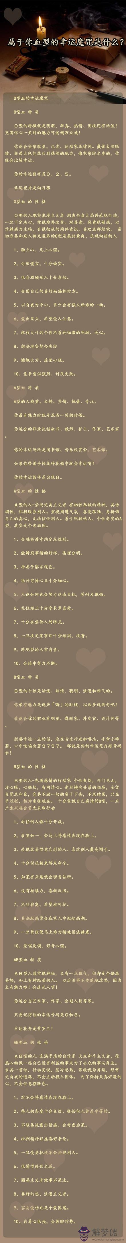 血型幸運魔咒有什麼 解夢佬 2021年05月13日 18:36 0 【導語】每個血型都有一個特殊的幸運魔咒,它會在你需要的時候出現并幫助你,而且它深深的刻在你的性格里。想知道屬于你血型的幸運魔咒是什麼嗎?趕緊跟星座屋小編來看看吧!(完)以上就是血型幸運魔咒有什麼的全部內容,如果你想閱讀更多血型的相關資訊,搜索“解夢佬算命網熊掌號”關注并回復“血型”,免費為您解答。