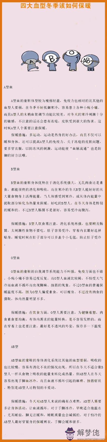 分享:四大血型冬季該如何保暖 解夢佬 2021年05月13日 18:51 0 【導語】天冷了,雖然南方的冬天算不上是很冷的東西,每個北方人都說南方都沒有冬天的。哈哈,其實小編覺得南方的冬天很冷啊!都要穿雪地靴+棉褲了。因為小編是正宗的南方人,所以覺得還是很冷的,北方的人兒就不同了,你們習慣了生活在零下幾度的冬天,來到這邊10度左右的肯定覺得暖和。那麼其實今天小編要講的是,四大血型在冬天的時候要怎麼保暖呢?馬上跟星座屋來看看下面這一副圖片文字吧。 以上就是分享:四大血型冬季該如何保暖的全部內容,更多血型資訊請關注解夢佬算命網。