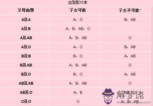 血型按AB0系統可分為A型、B型、0型和AB型4種。不同向型的準爸爸準媽媽,可以按照下表對未來寶寶的血型做一個推測。A型有AA和AO兩種基因,B型是BB和BO,O型和AB型各為一種,即OO和AB。父母雙方均為A型,且基因都是AA的場合,子女自然只能是A型。如雙方父母的基因都是AO,其子女的血型有A型和O型兩種可能。一方的基因為AA,另一方為AO的A型父母,則子女的血型是基因為AA或AO的A型。B型的場合完全相同。O型和AB型的父母,子女的遺傳基因為AO或BO,即只可能是A或B型的血型。父母均是O型,子女當然也是O型,父母均是AB型血型時,子女的血型有基因為AA的A型、BB的B型以及AB型三種可能。