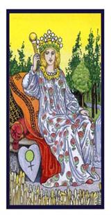 牌面B顯示一位美麗的金發女子倚靠在巨大的座椅中,她身材姣小,頭戴金冠,手捧圣杯,面容祥和,姿態優雅,神情專注的凝視著手里的圣杯,正沉浸在自己的世界和幻想中。
