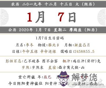 農歷:二0一九年十二月十三日,公歷:2020年01月07日,星期二,摩羯座