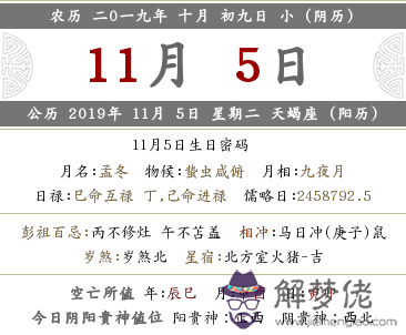 農歷:二0一九年十月初十日,公歷:2019年11月06日,星期三,天蝎座