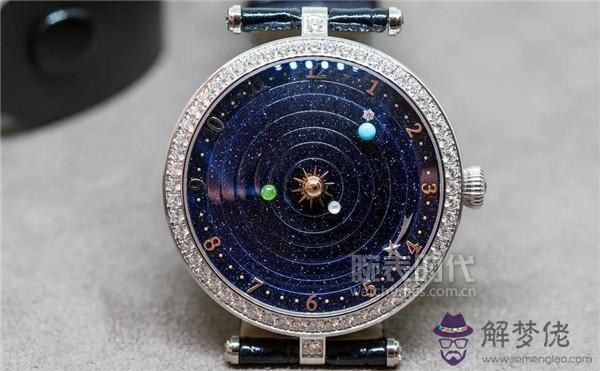 男款腕表采用了白金表殼和藍色琺瑯表盤,表盤中用白金的雕刻框架繪制了十二星座的圖案,看起來簡單,但藝術感很強。