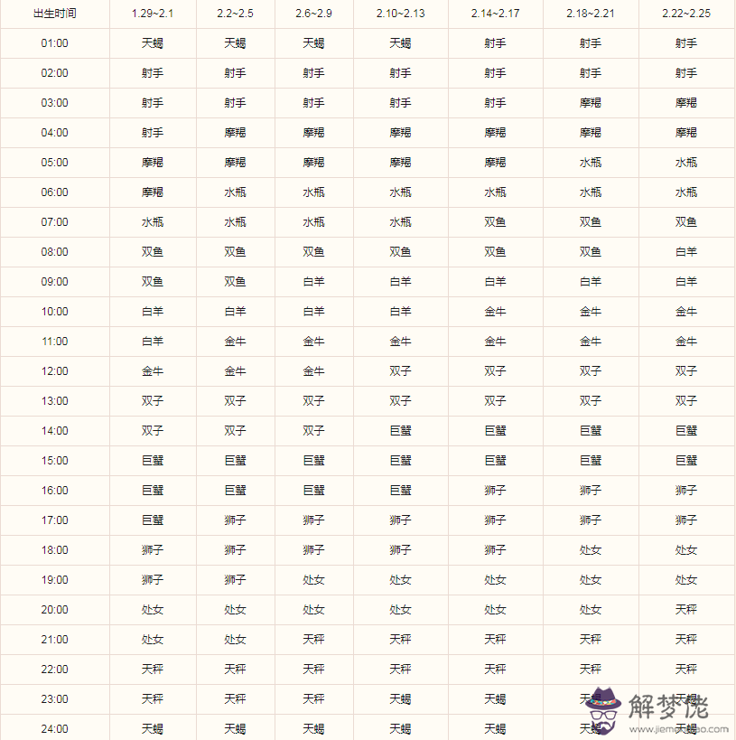 比如,如果是3月1日凌晨05:00出生的雙魚座,查詢上表,可以得出自己的上升星座是水瓶座。