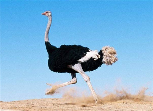 是世界上最大的一種鳥類,成鳥身高可達2.5米,雄鴕鳥體重可達150千克。像蛇一樣細長的脖頸上支撐著一個很小的頭部,上面有一張短而扁平的、由數片角質鞘所組成的三角形的嘴,主要特點是龍骨突不發達,不能飛行,也是世界上現存鳥類中唯一的二趾鳥類,在它雙腳的每個大腳趾上都長有長約7厘米的危險趾甲,后肢粗壯有力,適于奔走。