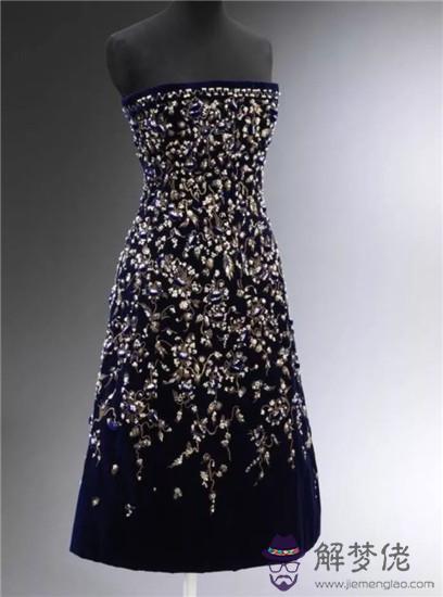 迪奧在1956年設計的“Bosphore”晚裝,款式極簡,但面料與裝飾極其奢華——藍黑色天鵝絨上用金線、銀箔葉、珍珠、寶藍絲絨、各色水鉆、亮片、數種小花珠片繡出繁復細密到令人眼花繚亂的圖案。