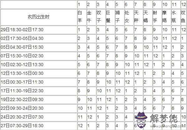 月亮星座的查詢:上表的日期都是以農歷來計算,舉例來說:某人為天蝎座,代碼為8,農歷生日為 10月19日12:00,所以再找17日11:30-19日22:30那一欄,對照得3,而3為雙子座,可知他的月亮星座為雙子。就這麼簡單!